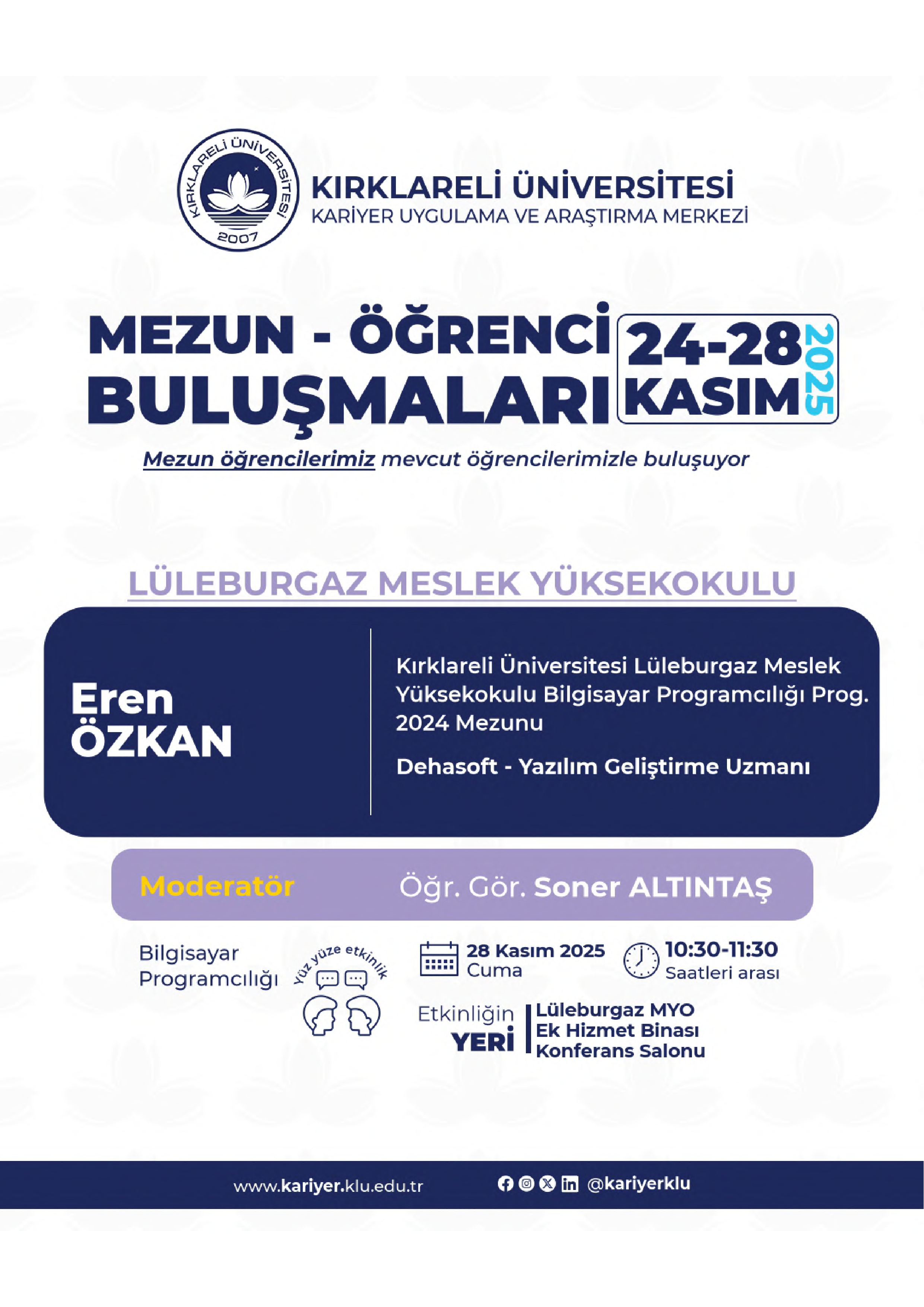 Bölümümüzden 2024 yılında mezun olan ve aktif olarak Dehasoft şirketinde Yazılım Geliştirme Uzmanı olarak çalışan mezun öğrencimiz Eren ÖZKAN, okul ve sektör deneyimlerini mevcut öğrencilerimizle paylaşacaktır.